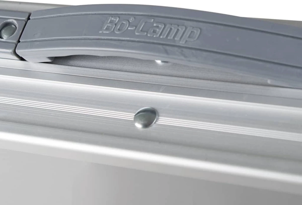 Deze stabiele Bo-Camp Premium inklapbare campingtafel is perfect voor kamperen, picknicken, barbecueën en meer. De klaptafel is gemaakt van lichtgewicht aluminium met een waterdicht en hittebestendig tafelblad. Dankzij de verwijderbare poten en het deelbare tafelblad kan je de tafel gemakkelijk inklappen en meedragen als een koffer. De poten zijn verstelbaar in 2 hoogtes (36 / 70 cm) en hebben stelschroeven voor een fijne afstelling. Onder het tafelblad zit een net om spullen in op te bergen. Het compacte inklapbare ontwerp en de handgreep maken de draagbare tafel gemakkelijk mee te nemen.